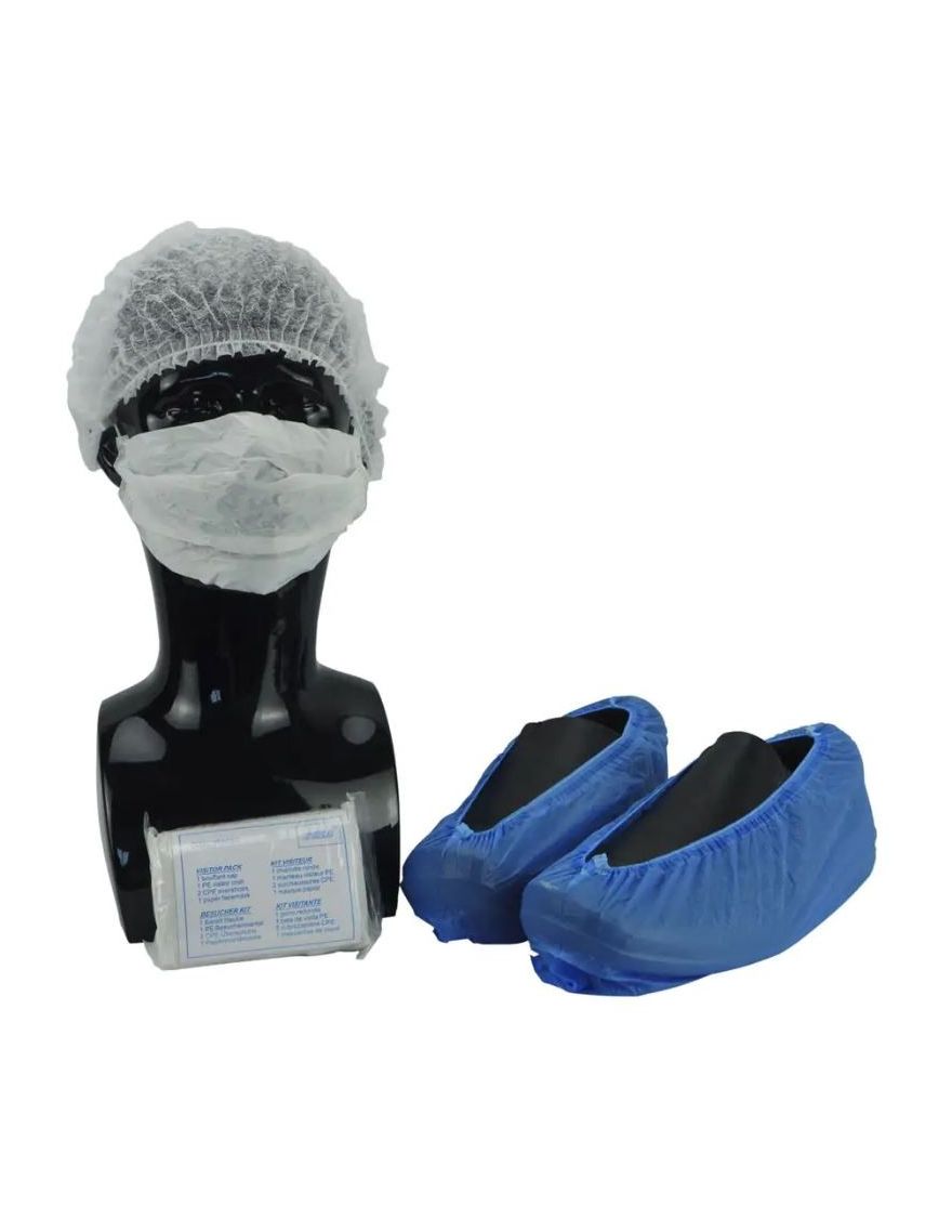 Ce kit se présente sous sachet plastique individuel et comprend : 1 blouse visiteur blanche polyéthylène 20g/m2, 1 charlotte clip blanche élastiquée, 1 masque blanc 1 pli, 2 surchaussures bleues